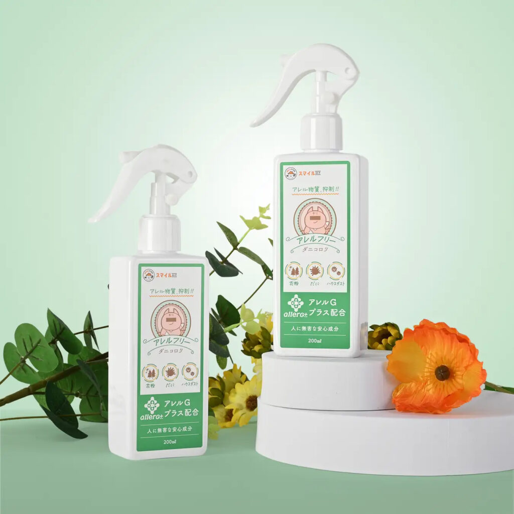布団・ソファ・カーペットなどに吹きかけるだけで、アレルギーの原因とされる「ダニの糞・死骸」を抑制するスプレー。化学成分は不使用で、天然鉱物由来の無機塩「アレルGプラス」を主成分としています。