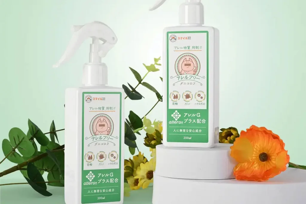 布団・ソファ・カーペットなどに吹きかけるだけで、アレルギーの原因とされる「ダニの糞・死骸」を抑制するスプレー。化学成分は不使用で、天然鉱物由来の無機塩「アレルGプラス」を主成分としています。