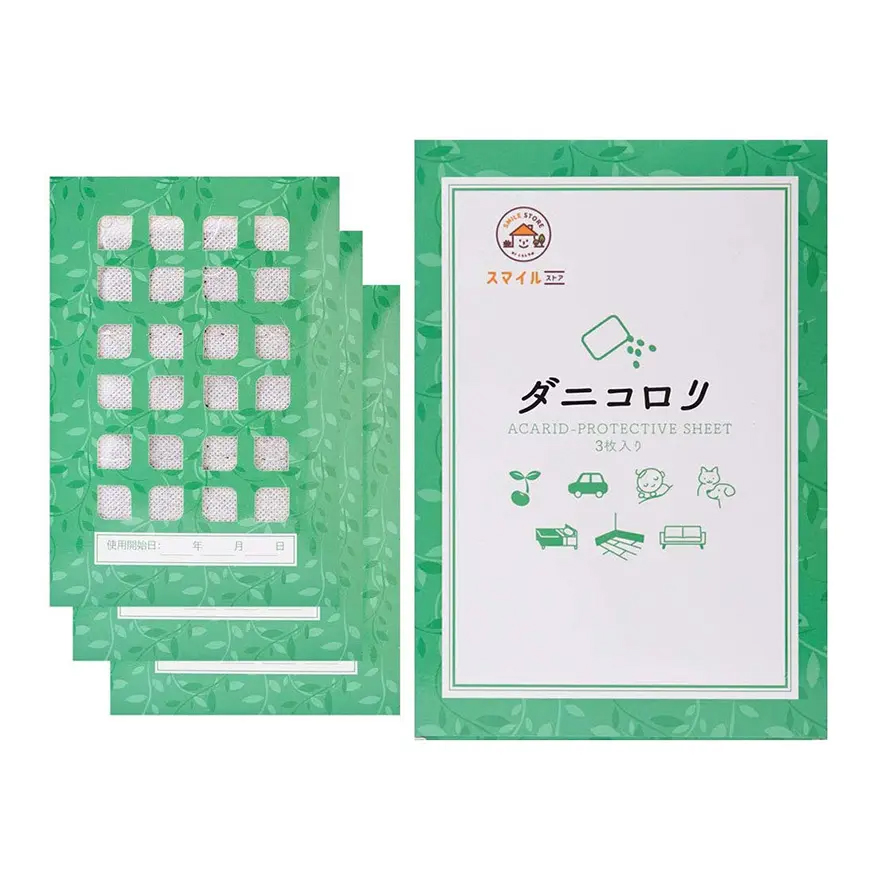 布団、ソファ、カーペットなどダニが気になる場所に置くだけで、ダニを集めて退治できる、置くだけ簡単!ダニ取りシートです。有害な殺虫成分は不使用で、誘引剤には食品級、乾燥剤は植物性の無害なものを使用しております。使い終わったらゴミ箱に捨てるだけで始末も楽ちんなダニ対策商品です。『ダニコロリ』1枚で5〜8畳と広範囲をカバー。各部屋1枚でダニを徹底的に退治します。
